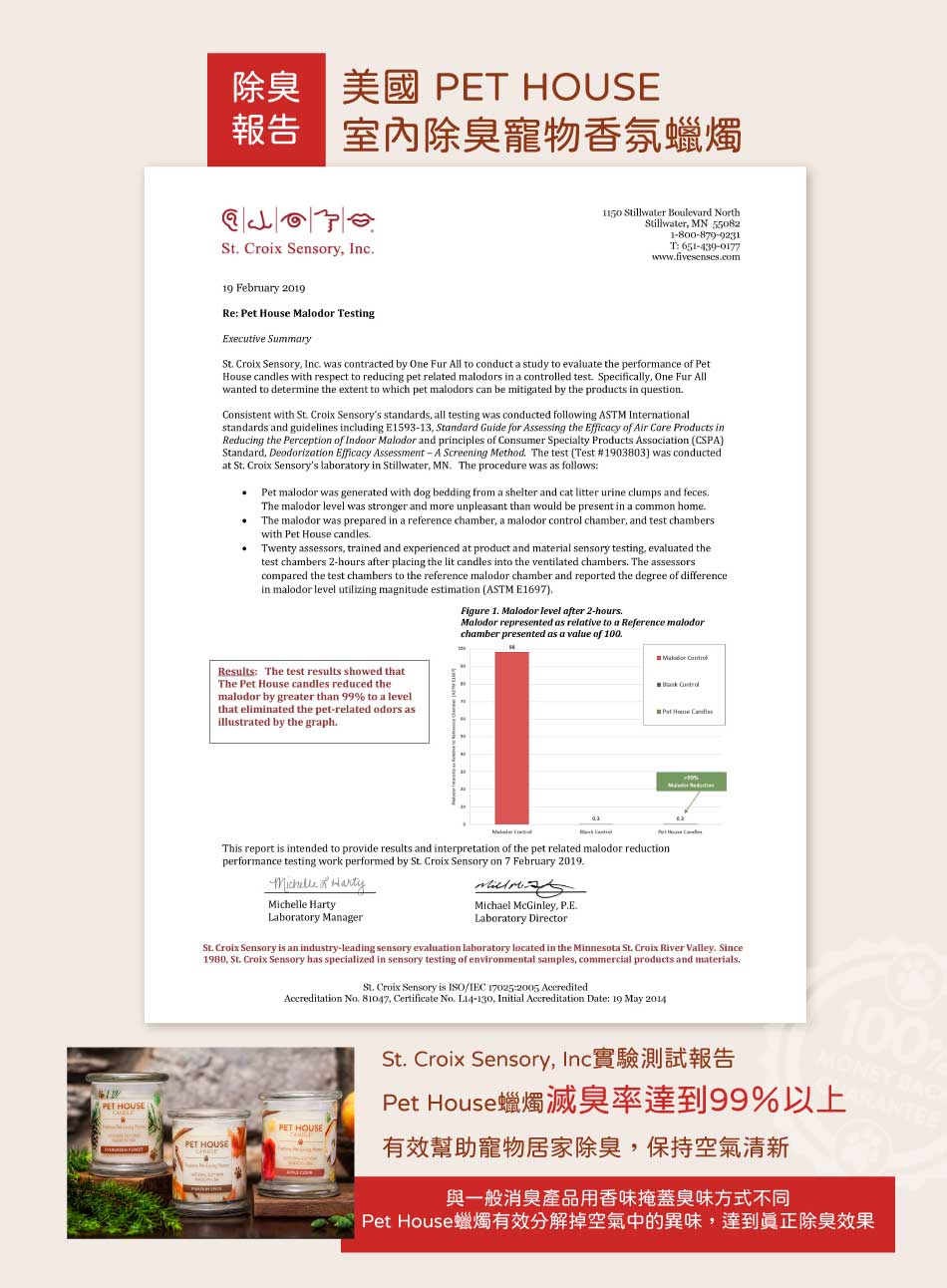 美國 PET HOUSE 室內除臭寵物香氛蠟燭-St. Croix Sensory, Inc實驗測試報告,Pet House蠟燭滅臭率達到99%以上有效幫助寵物居家除臭,保持空氣清新。